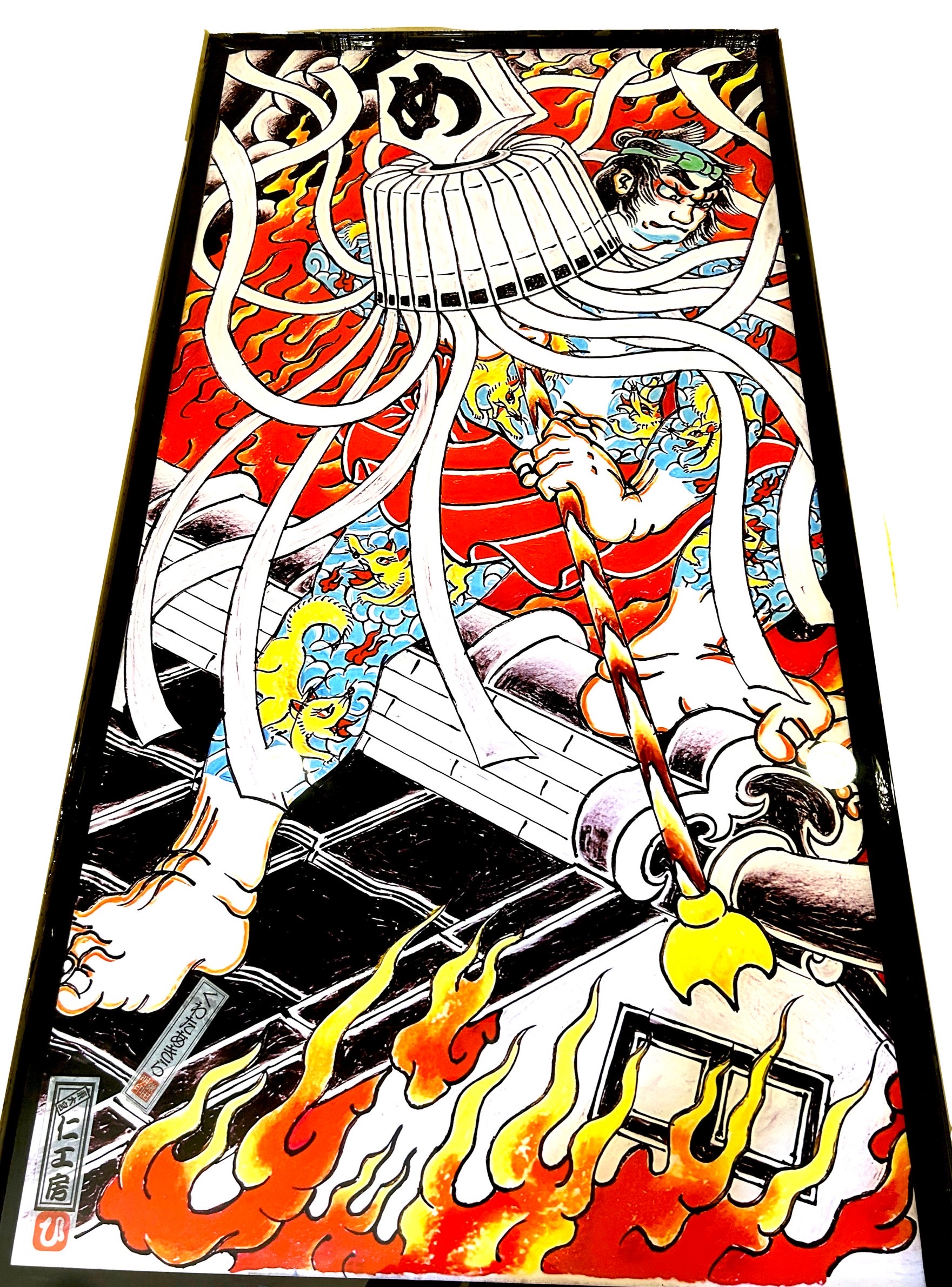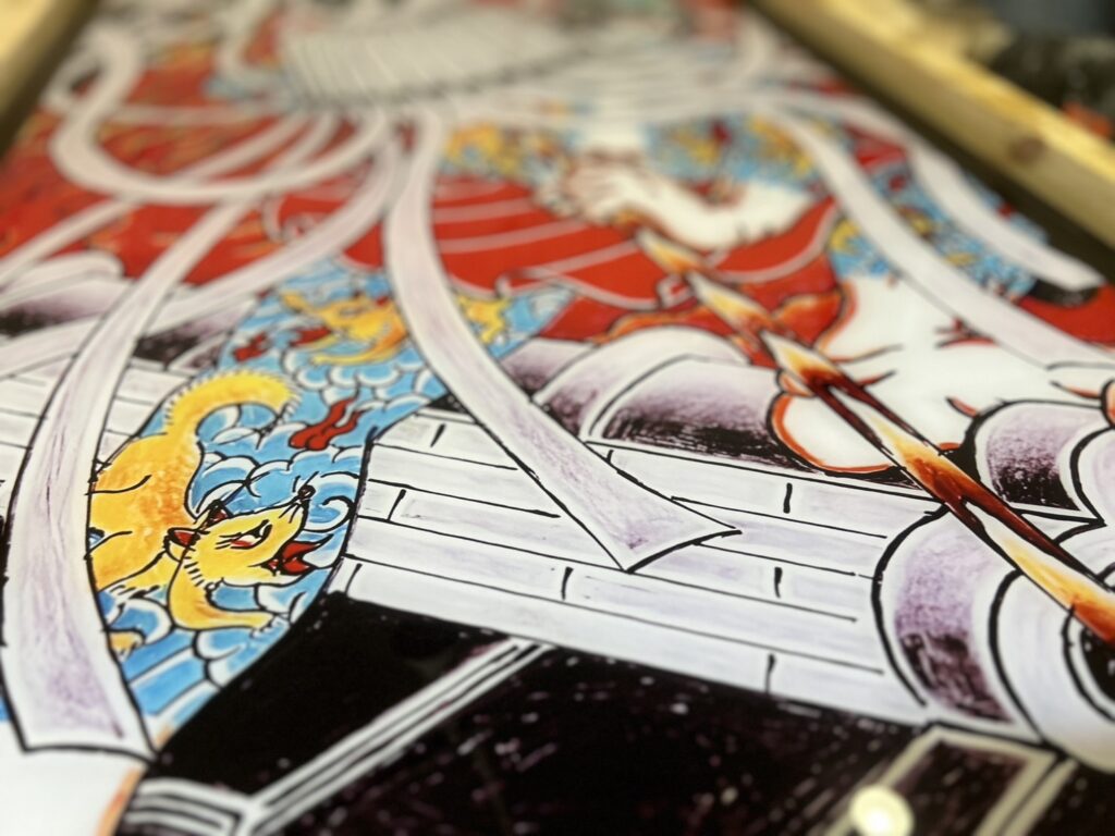 このお客様の自宅に招かれて話しをしていたときに飾ってある絵が気になり聞いたところご自分が色鉛筆で書いた絵だという話しを聞き、「この絵をテーブルにしませんか?」と突然突拍子もない発言をしたところ、「そんなことが出来るのですか?」と聞かれて「たぶん出来ると思います。」そう答えて原画をテーブルの大きさに引き伸ばす調査をしたところ可能だという事が解り、早速お客様に報告し、テーブルの制作に取りかかりました。完成して納品してから約一ヶ月後に、このテーブルの枠に木を付ける事は出来ないか?と言われ再度持ち帰り作業開始。