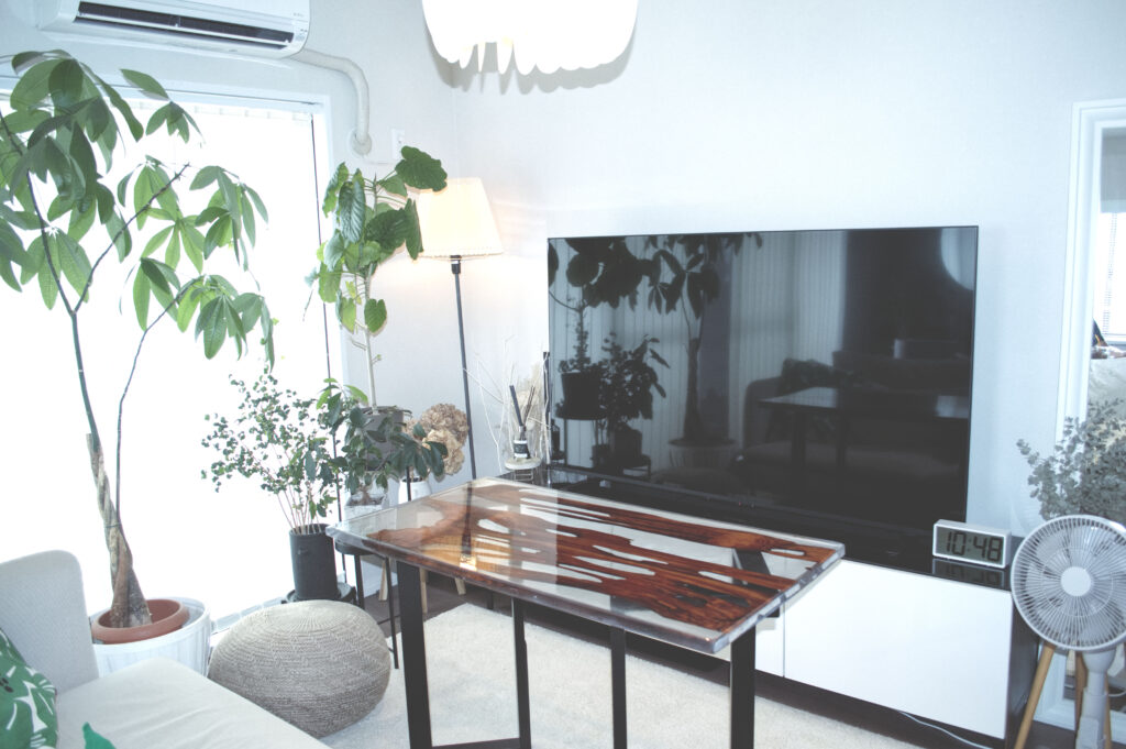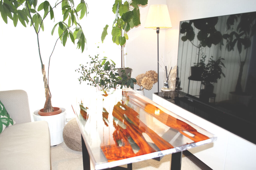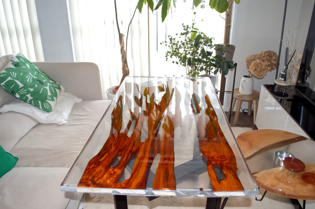 屋久杉に透明のレジンが醸し出す高級感と部屋をとても綺麗に見せる輝きは最高のリビングルームの調和。